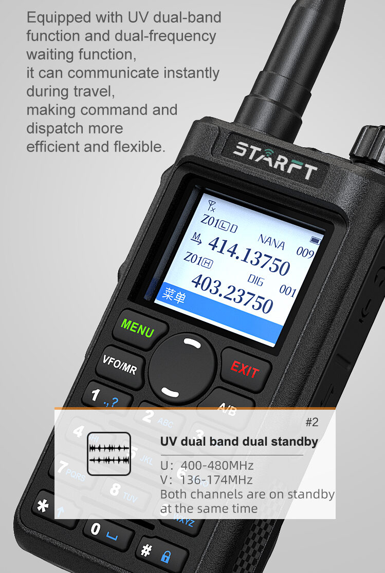UV58D DMR radio supports U/V dual band. It can freely switch between different modes, dual standby and dual guard, dual standby and single guard, single standby and single guard.