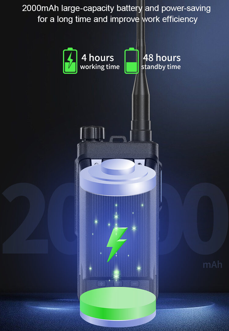 UV58D radio is powered by a 2000mAh Li-ion battery. You can continuously use this radio for 4 hours after one charge.